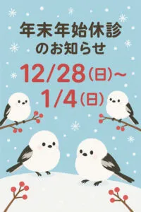 年末年始の休診は12月28日(日)〜1月4日(日)です。
